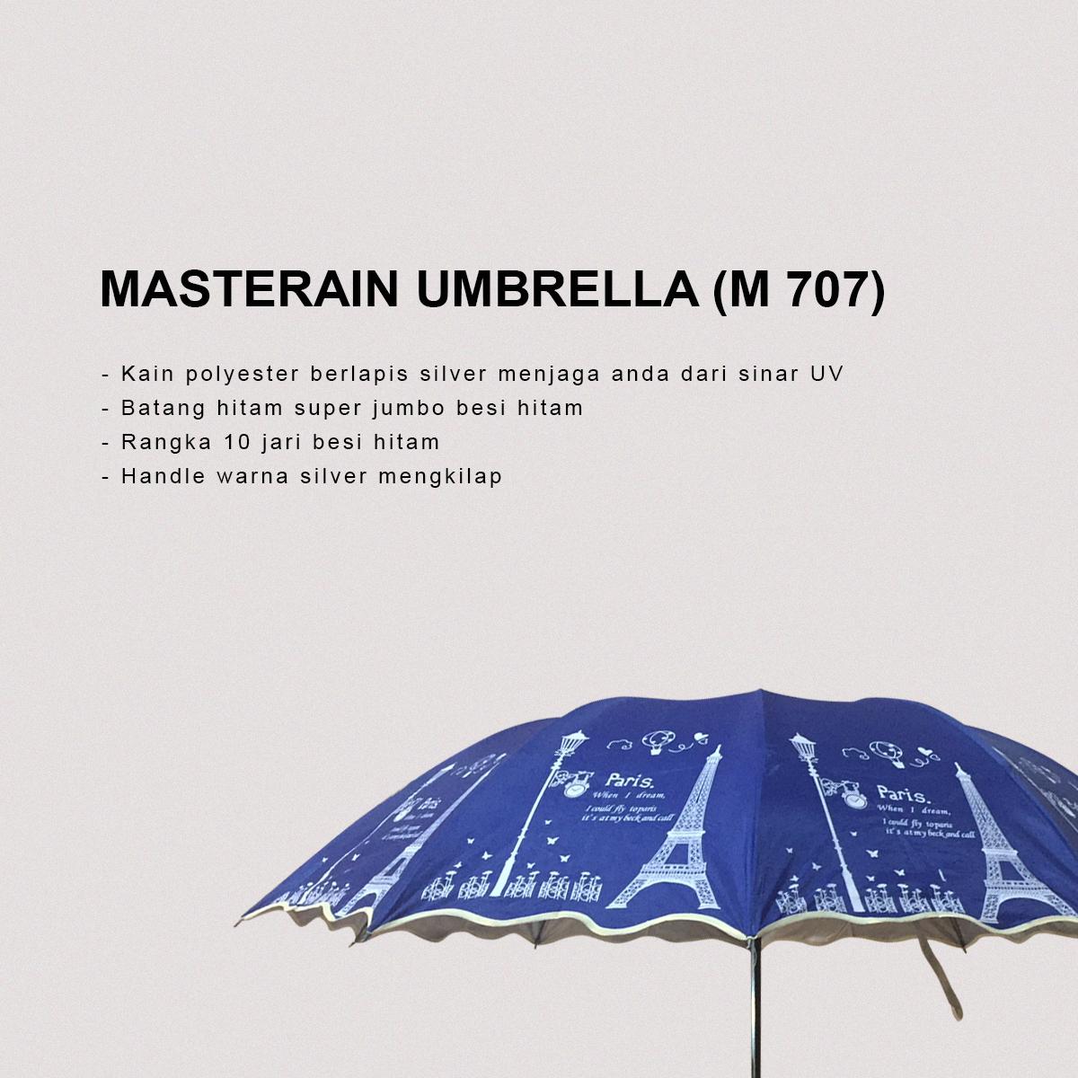 Lindungi dirimu dari panas dan hujan dengan payung Masterain. Masterain adalah brand / merek yang secara khusus bergerak di bidang peralatan hujan. Oleh karena itu, kualitas payung ini tidak perlu anda ragukan.